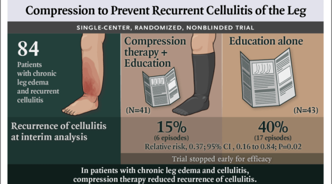 New England Journal of Medicine (Aug 13, 2020) – In this small, single-center, nonblinded trial involving patients with chronic edema of the leg and cellulitis, compression therapy resulted in a lower incidence of recurrence of cellulitis than conservative treatment.