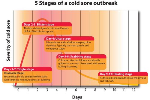 There it multiplies and forms painful blisters, or “cold sores”. Sunburning of the lips, a “cold”, or psychological strain are examples of the stresses that can trigger cold sores. Reduced resistance is the common factor.
