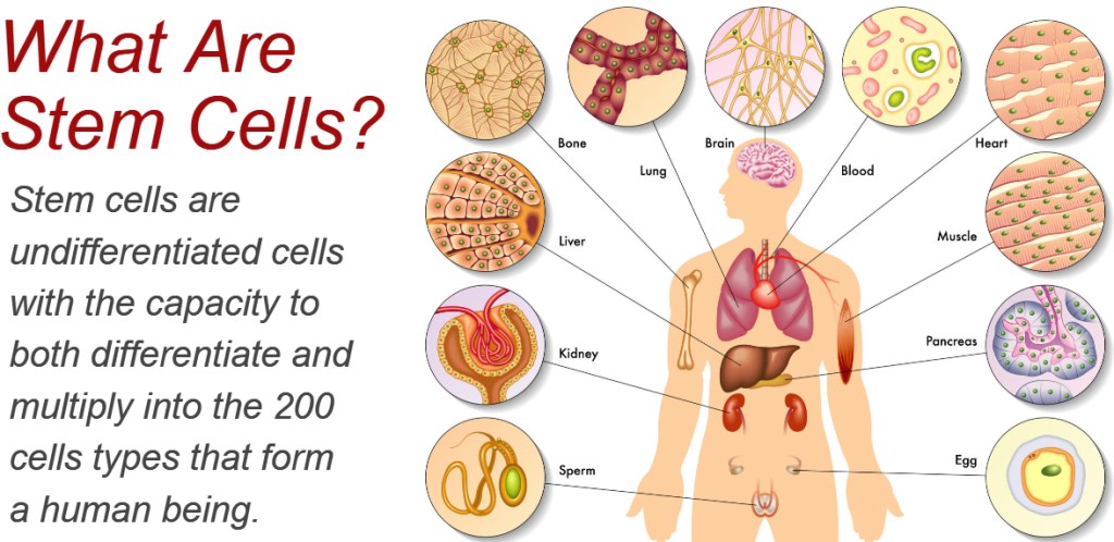 The ultimate stem cell is the fertilized egg from which we came. This omnipotent stem cell divides countless times, “differentiates”, and forms more and more specialized tissues, and our body is the eventual result. All of our tissues contain some stem cells, which grow increasingly rare as we age.