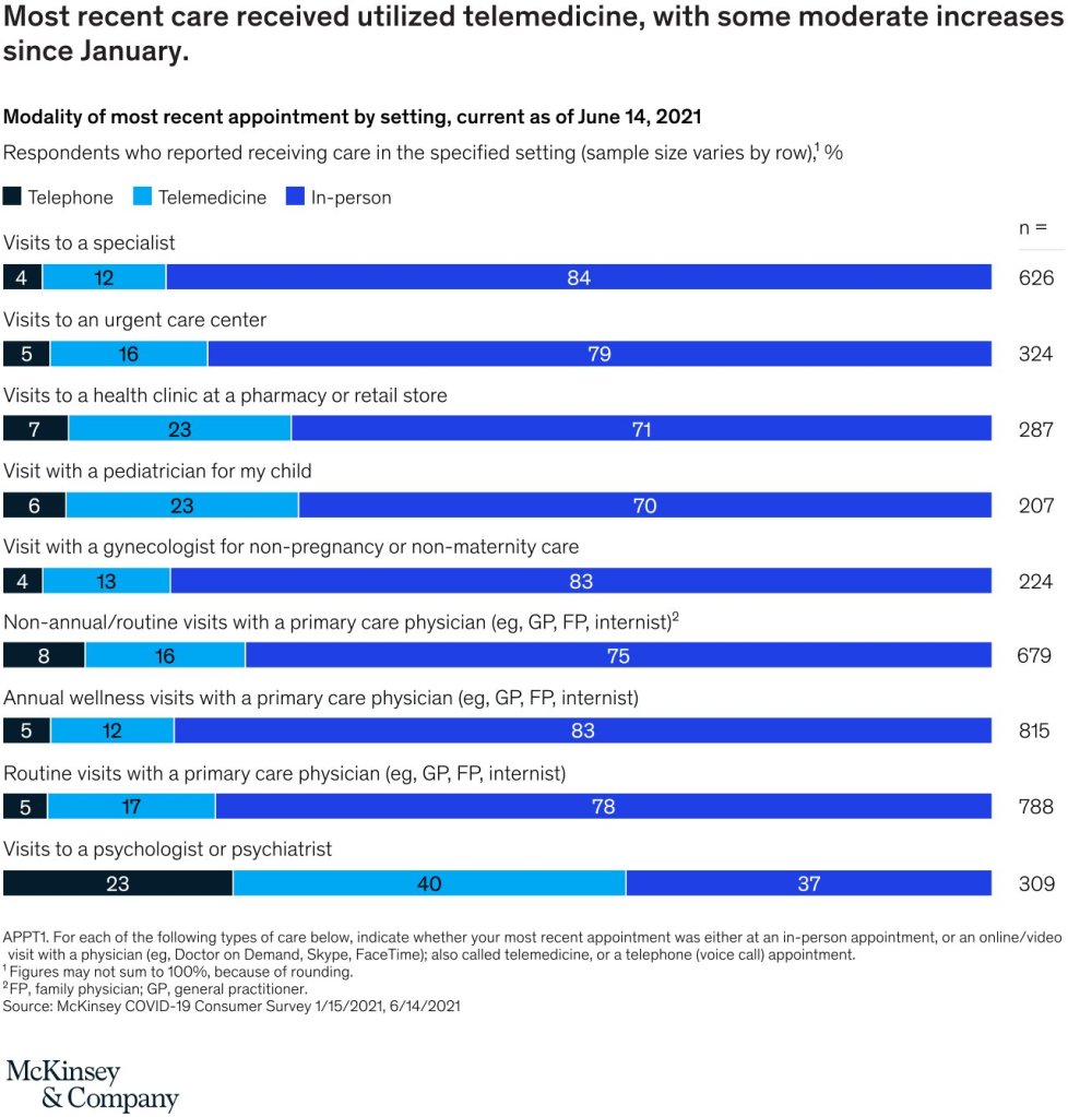 - Telehealth utilization has stabilized at levels 38X higher than before the pandemic. After an initial spike to more than 32 percent of office and outpatient visits occurring via telehealth in April 2020, utilization levels have largely stabilized, ranging from 13 to 17 percent across all specialties.2 This utilization reflects more than two-thirds of what we anticipated as visits that could be virtualized.3