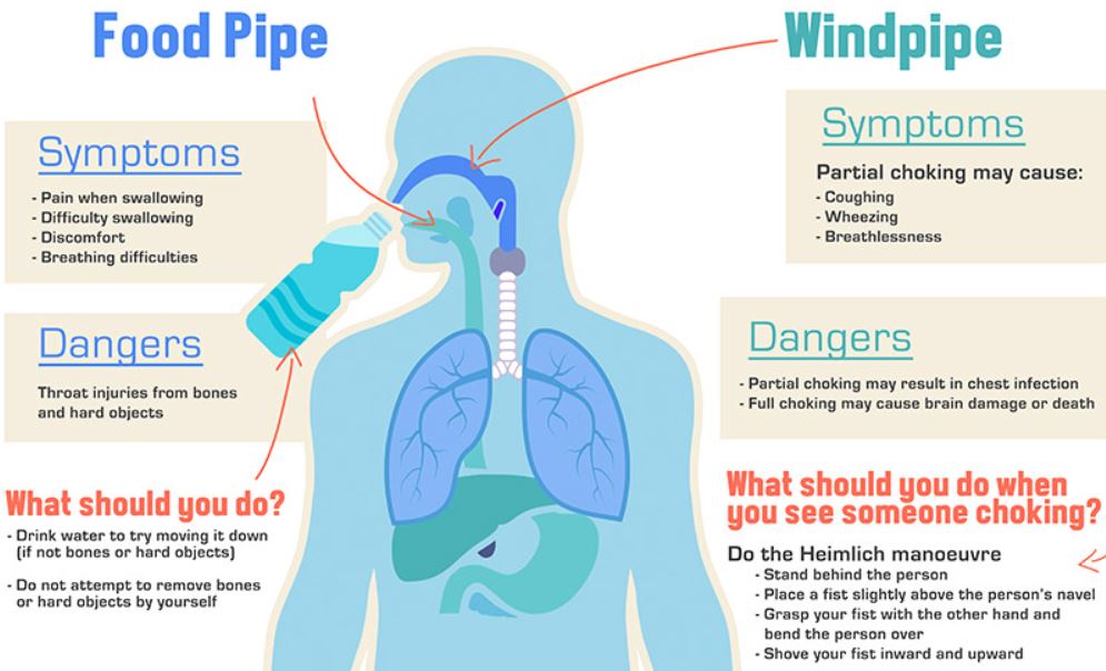 This post will be on “choking”, or getting the food into the Airway instead of the Esophagus, or swallowing tube. In the future, I will develop a post in “swallowing difficulties”, or trouble getting the food to pass easily and freely down the esophagus into the stomach.