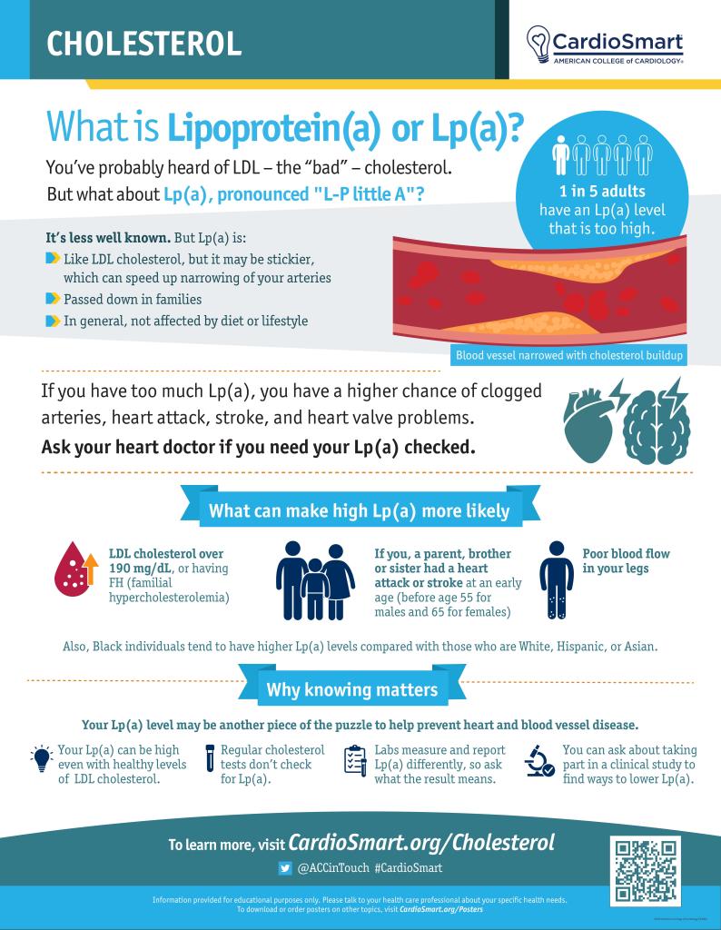 Lp(a), pronounced “L-P little A” is like LDL cholesterol, but stickier, which can speed up narrowing of your arteries. If you have too much Lp(a), you have a higher chance of clogged arteries, heart attack, stroke, and heart valve problems.