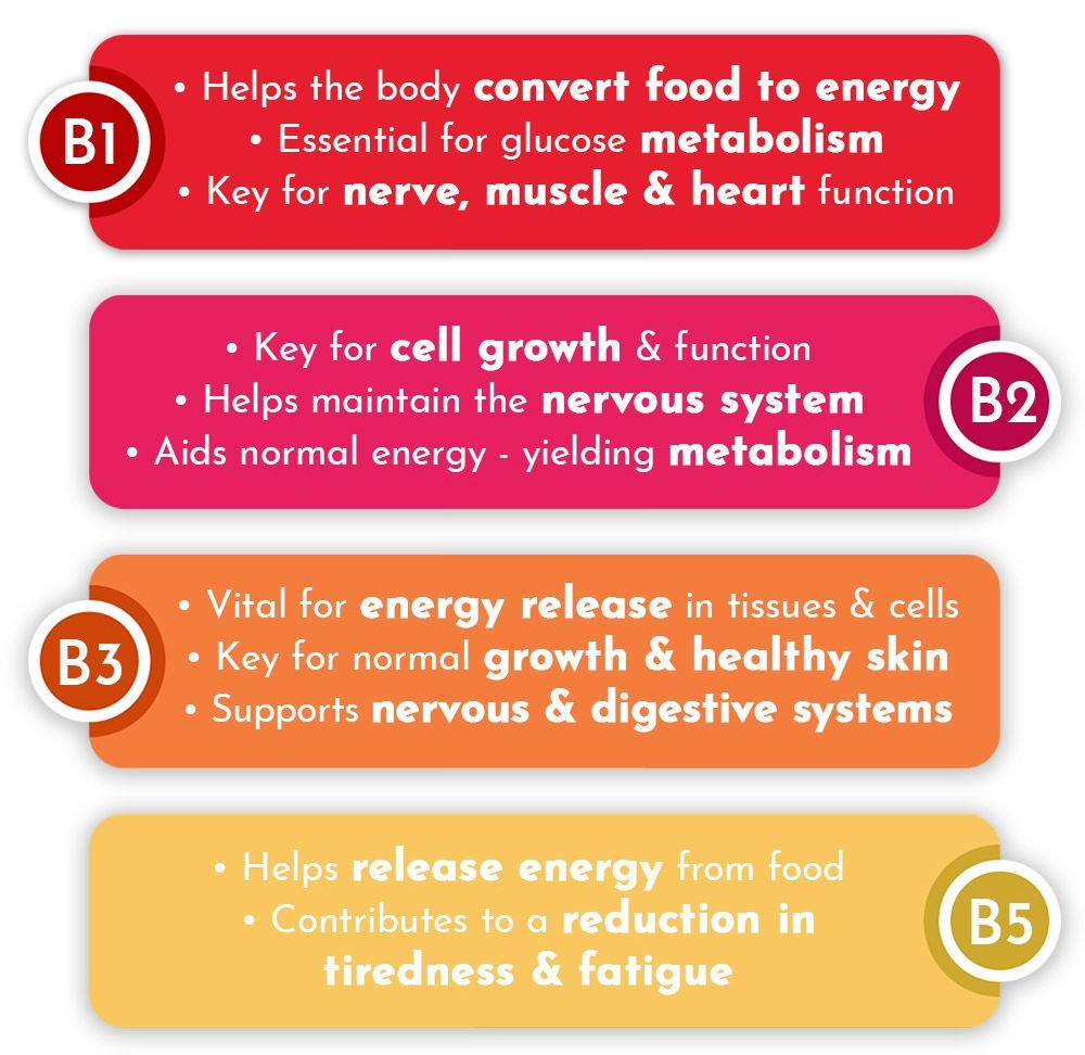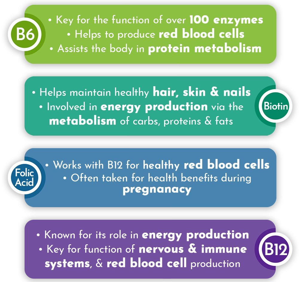 As a group, B vitamins produce energy from nutrients, support immune function, regulate cell growth, maintain Myelin, and maintain RBCs, among other crucially important things.