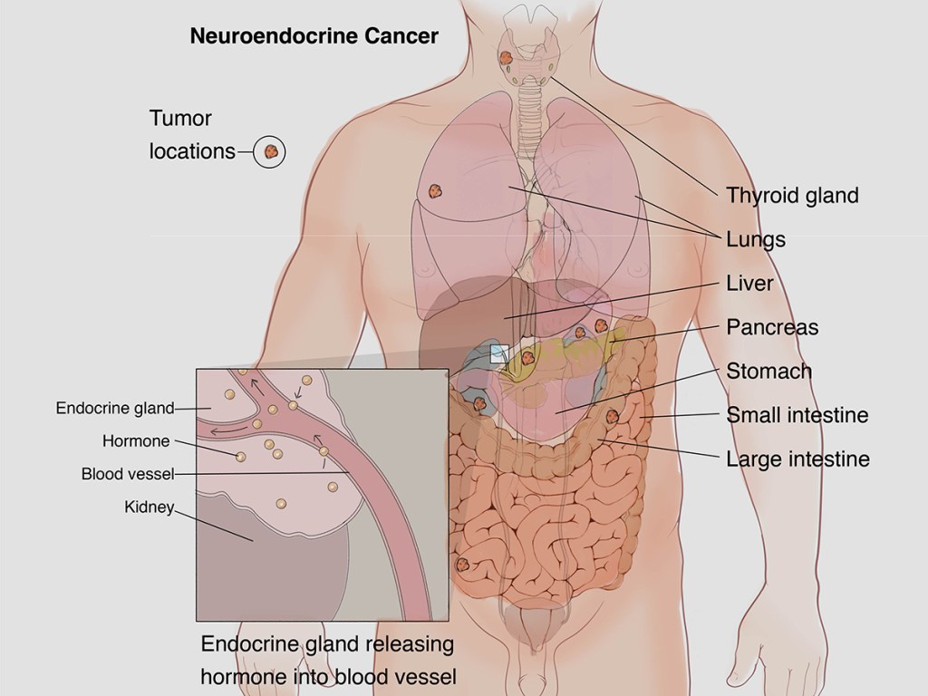 Carcinoid tumor is a good illustration. These are so called neutoendocrine tumors. They are slow growing, and are usually not detected until they are quite advanced. They can be located in different organs such as the gastrointestinal tract and the lung.
