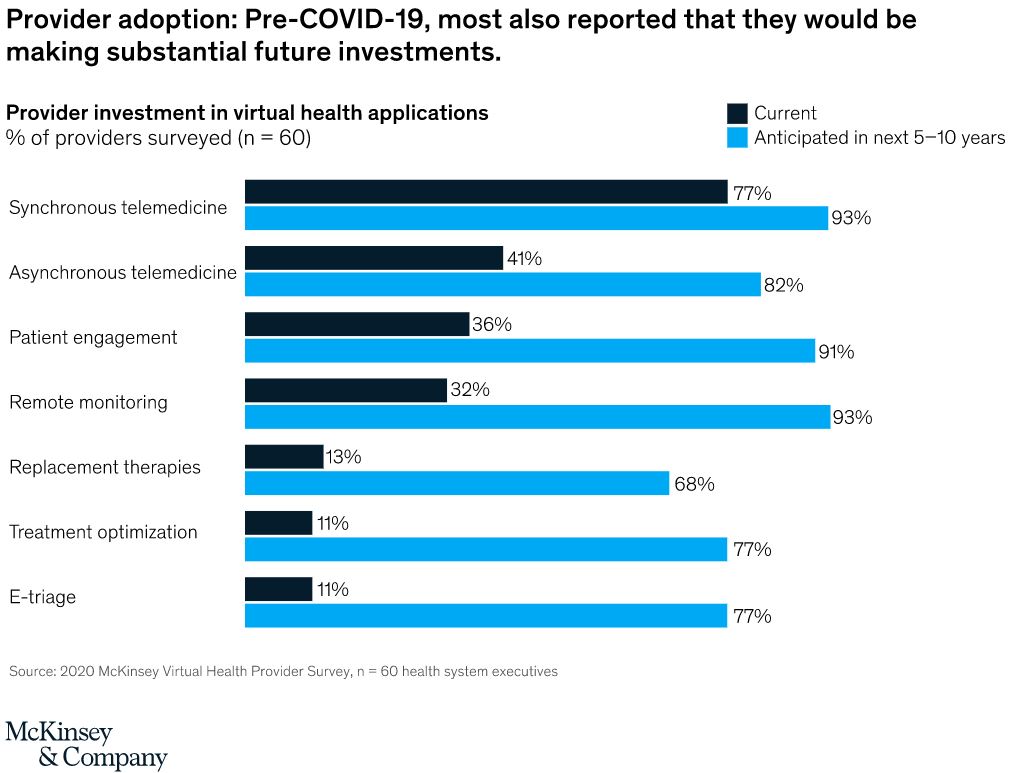 - Investment in virtual care and digital health more broadly has skyrocketed, fueling further innovation, with 3X the level of venture capitalist digital health investment in 2020 than it had in 2017.4