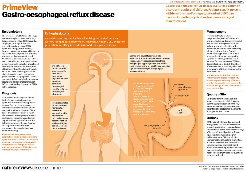 Gastro-oesophageal reflux disease (GERD) is a common disorder in adults and children. The global prevalence of GERD is high and increasing. Non-erosive reflux disease is the most common phenotype of GERD. Heartburn and regurgitation are considered classic symptoms but GERD may present with various atypical and extra-oesophageal manifestations. The pathophysiology of GERD is multifactorial and different mechanisms may result in GERD symptoms, including gastric composition and motility, anti-reflux barrier, refluxate characteristics, clearance mechanisms, mucosal integrity and symptom perception.