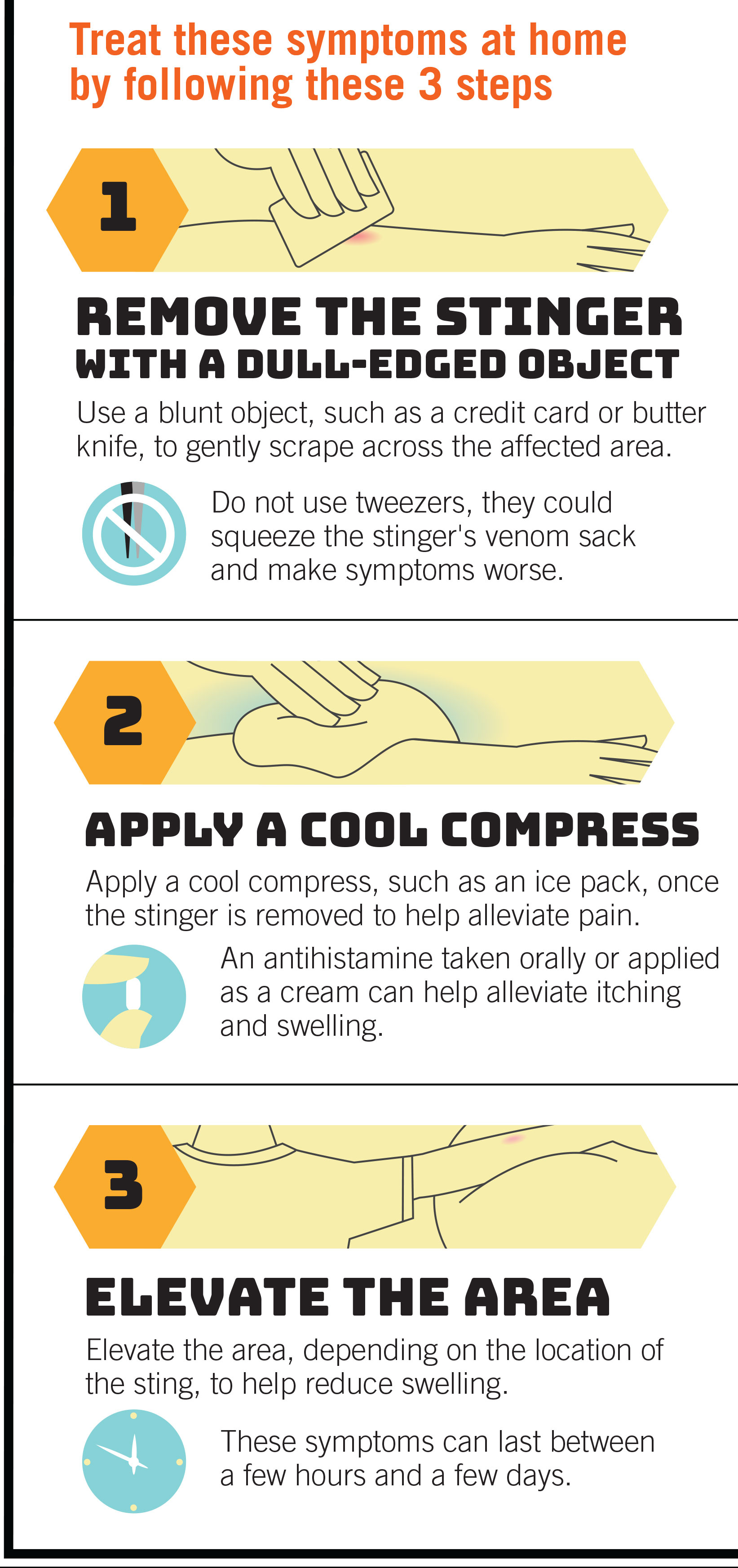 A bee sting with hives developing on the skin but no other symptoms usually requires nothing more than an antihistamine. Interestingly, I had a bee sting on my foot after walking on the beach, became itchy all over and developed hives, received desensitization, and had no more trouble with the several stings I had later.